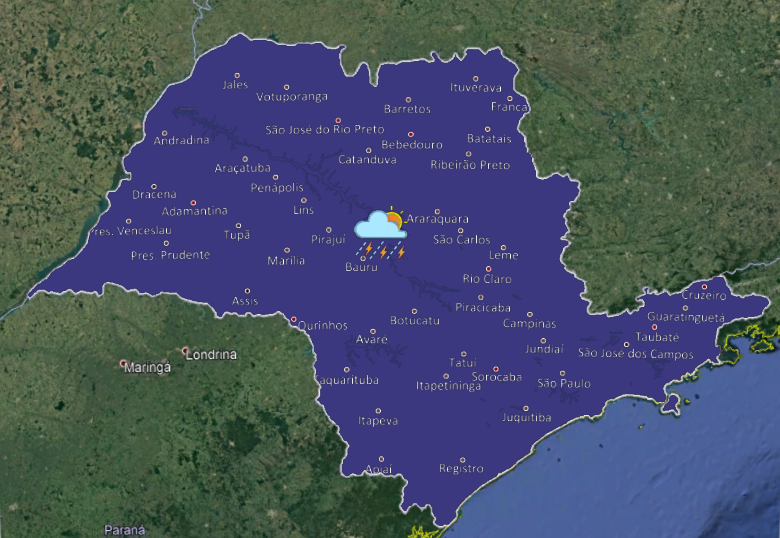 Áreas de chuvas fortes sobre o estado de São Paulo, regiões de Rubiácea, Birigui, Bilac, Guararapes, Jaboticabal, Ribeirão Preto, Araras, Itirapina e Pederneiras.