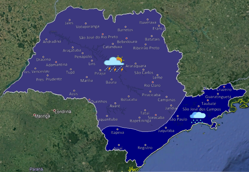 Chuvas moderadas a fortes nas regiões de Bauru, Avaí, Cafelândia, Guarantã, Rio Claro, Ribeirão Preto, Piracicaba e Itapetininga
